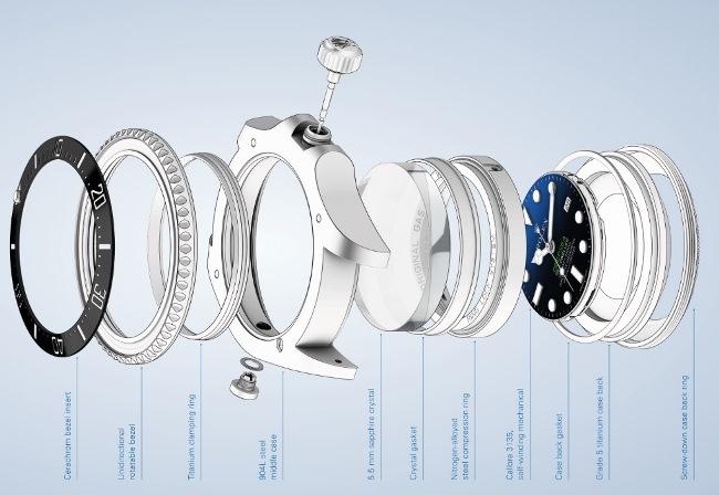雖然Ringlock System錶殼結構的外觀與蠔式錶殼並無二致,但是Ringlock System的設計概念,則是改變以往鏡面、錶殼與底蓋的支撐點,透過中間的氮合金不鏽鋼圓環作為腕錶內部的支架,對前端厚達5.5mm的藍水晶玻璃和後底蓋起支撐的作用,抗壓能力更為強悍。