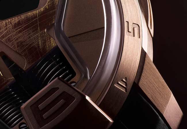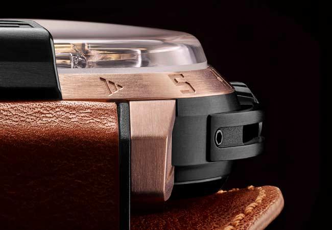 第一款Skull 48.8的錶殼採用玫瑰金(5N)製成。外錶圈指示小時。外側錶盤經微噴砂處理,呈現迷人的粒面質感。搭配黑色霧面鱷魚皮錶帶。第二款Skull 48.8結合玫瑰金(5N)和黑色DLC鈦金屬,外側錶盤覆以一層碳灰色電鍍塗層。干邑色仿舊皮革錶帶配備橡膠內襯,並附有同款手環。