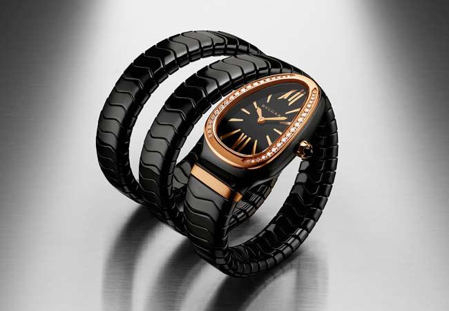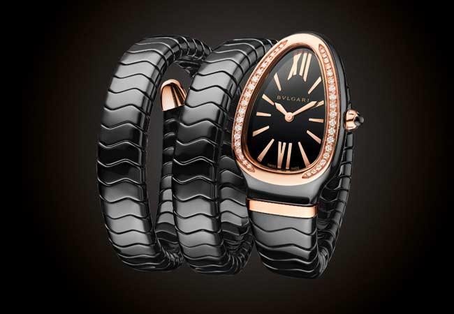 百變的 Serpenti腕錶為美好歡快的時光之舞譜出悠揚節奏。除結合彩色 K 金以及繽紛皮革,Serpenti更揉合兼具科技性與珍貴性材質,出乎意料的組合嶄露豐碩成果。Serpenti Spiga腕錶無論黑白色款,皆飾以玫瑰金元素,陶瓷錶帶的靈活性可與金屬或皮革材質媲美,同樣以雙圈造型盤繞手腕 -玫瑰金材質的錶殼流暢銜接錶帶,襯托出黑白漆面錶盤,流露出充滿現代感的色澤魅力。Spiga此次更大膽嘗試史無前例的設計,將五圈黑色陶瓷錶鍊交織纏繞,搭配 18K 玫瑰金與鑽石,完美妝點腕間!