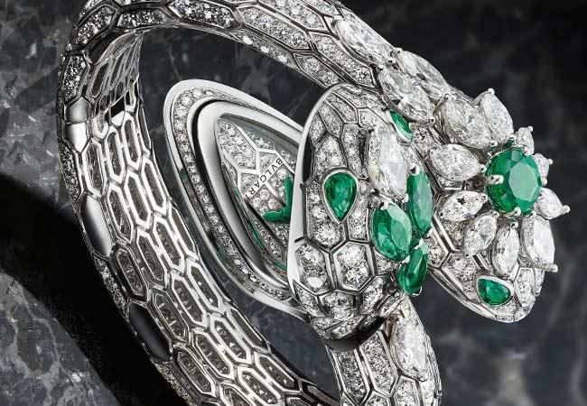 蛇形符碼改頭換面,進一步突破珠寶工藝的種種可能性,以嶄新面貌亮相。白金打造的 Serpenti Misteriosi猶如一只蘊藏「祕密」的獨特腕錶,首度融入雙頭蛇造型設計,該只腕錶不僅亮麗出眾,也向寶格麗經典蛇形符碼的致命艷麗致敬。每處細節都洋溢著女性魅力與歡愉氛圍,第一個蛇首頂上的花朵圖樣,係由一顆 2 克拉的圓形切割祖母綠,環繞九顆馬眼形切割鑽石所組成。輕撬起蛇頭蓋,錶盤立現。需耗時整整六個月,才能打造出這只充滿藝術美感的高級珠寶系列傑作。