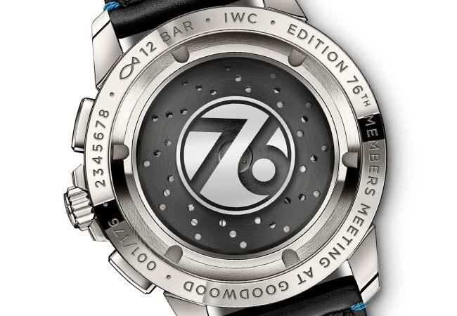 IWC萬國錶同時發表了工程師運動計時腕錶「第76屆古德伍德會員會議」特別版 (型號IW381201),這款兼具運動風格與典雅氣質的計時腕錶,以經典導柱輪設計,搭載IWC 69380型自製機芯,以棘爪上鍊系統為特色,具有46小時動力儲備。直徑44毫米的錶殼以鈦金屬打造,並具有錶冠防護,鍍銀錶盤、黑色副錶盤及覆有夜光材料的黑色指針,與藍色的計時指針形成強烈對比的錶盤佈局。此款有著運動風格卻不失典雅的腕錶襯以黑色小牛皮錶帶,限量176枚。軟鐵內殼保護機芯免受磁場效應的影響,錶殼下半部的靈感源自煞車盤,壓印的「76」字樣則是紀念第76屆古德伍德會員會議(Goodwood Members’ Meeting)。