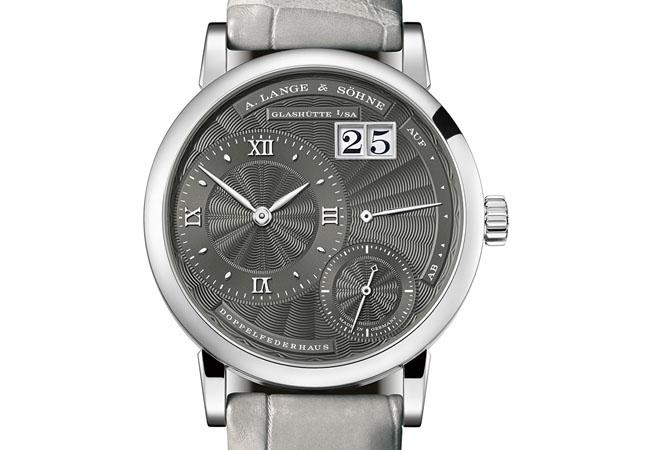 本款Little Lange 1搭配的是灰色面盤與灰色鱷魚皮錶帶,而位於大日曆下方的,則是實用的UP/DOWN動力儲存指示。36.8mm/18K白金/參考價EUR 32,500