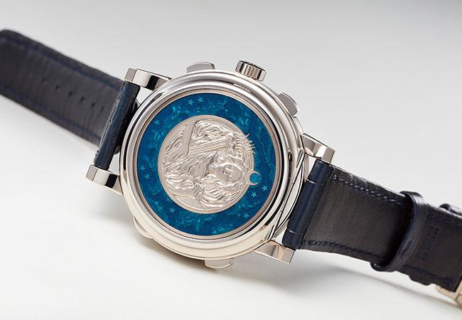 本錶款也是朗格首次在面盤與底蓋上糅合琺瑯藝術與雕刻工藝的腕錶,實心的18K白金成為深藍色琺瑯的基底,同時底蓋也以浮雕及「tremblage」雕刻方式勾畫描繪出月亮女神,機芯在獨特裝飾技巧下更顯高貴典雅。41.9mm/18K白金/參考價EUR 290,000