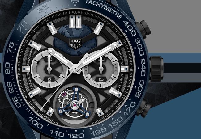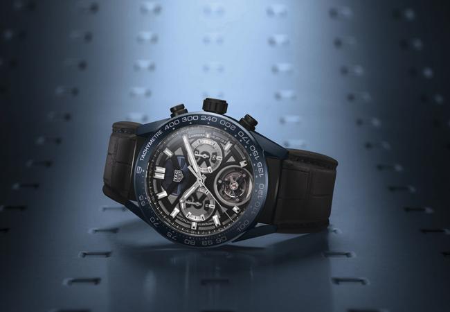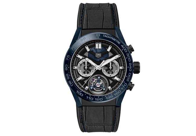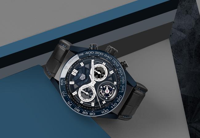 TAG Heuer今日發表現代感十足的全新TAG Heuer Carrera陀飛輪精密計時腕錶,以當代設計展現傳統製錶最著名的兩大複雜機制:陀飛輪和計時功能。機芯安置在迷人的夜藍色陶瓷錶殼中,搭配陶瓷錶圈和錶耳。機芯發條盒和擺陀點綴藍色。拋光、磨砂及微噴砂表面處理展現優雅與現代氣息,同時也顯露瑞士製錶工藝的高品質形象。「Tête de Vipère」印記銘刻在橋板上,透過錶底蓋的藍寶石水晶清晰可見。