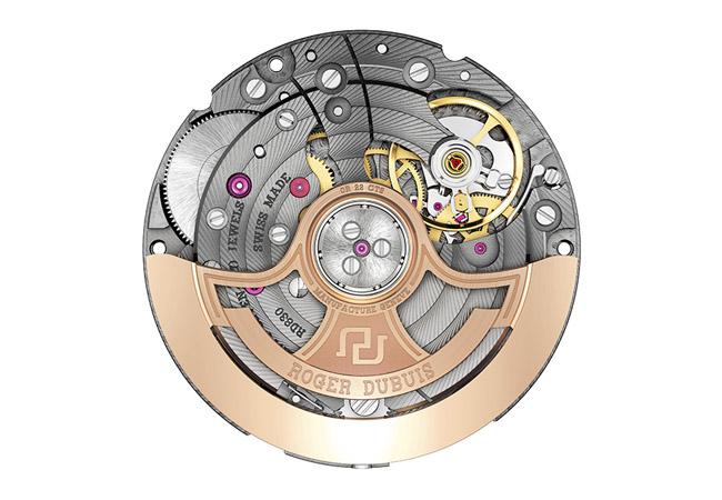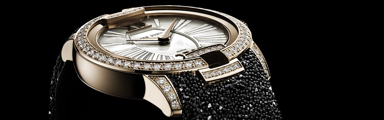 羅杰杜彼對於新物料的研發向來很有一套,近幾年和藍寶堅尼的合作又讓品牌的材質科技更上層樓,品牌將高分子聚合物轉化成熔鑄物質,表層再噴上具有光澤感的物料,固化後看起來就像是閃耀光芒的立體織紋布料,搭配鑲鑽錶圈更顯華麗。