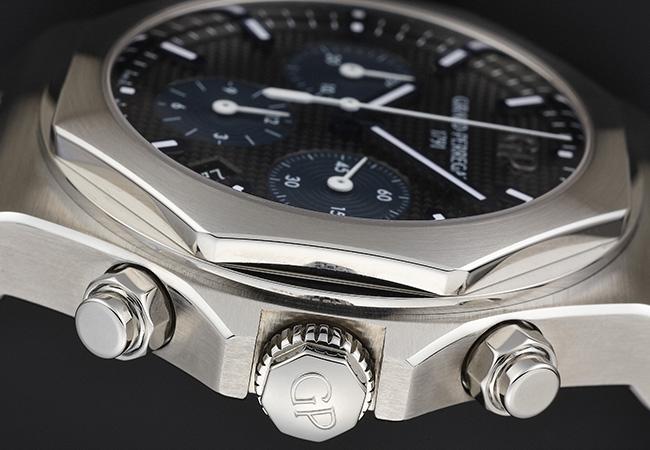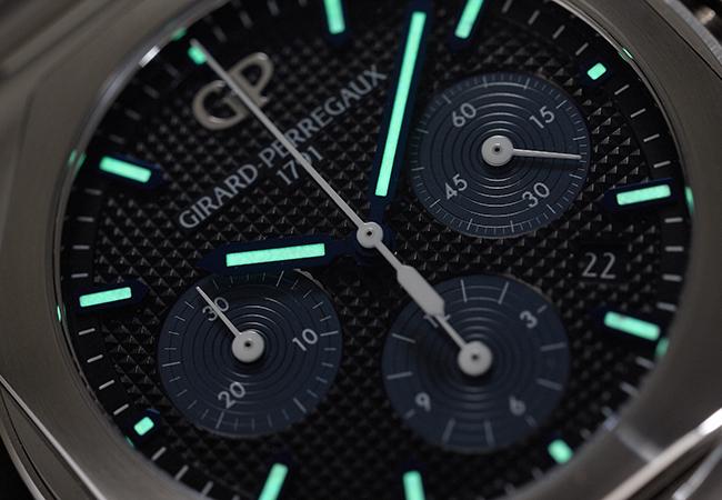 其中,計時碼錶包括38mm和42mm兩種尺寸,有不鏽鋼和玫瑰金兩種材質,面盤顏色則有銀色、黑色和藍色的配置,其上還有巴黎釘紋的點綴。這款是黑面搭配藍色計時盤的不鏽鋼版本,面盤和計時盤以兩種不同顏色區分,計時盤上的圓紋裝飾也和主面盤的巴黎釘紋做出區隔,細節算是做得不錯。