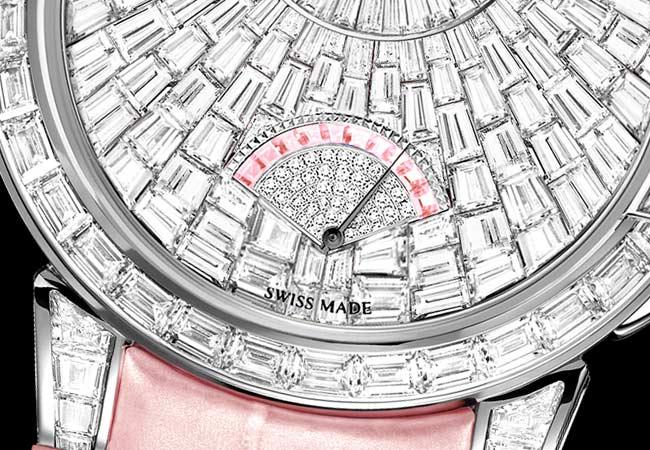 圓形偏心時分盤和 6 點鐘位置的扇形逆跳秒鐘顯示,與錶盤細密有致的幾何造型相映成趣。小錶盤鑲嵌 74 顆圓形明亮式切工鑽石,並點綴 10 顆長形切工粉紅剛玉及 32 顆圓形明亮式切工粉紅剛玉,清新動人,為腕錶增添一絲柔美而浪漫的氣息。