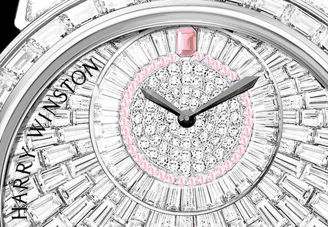 長形切工以纖長的長方形造型和八邊形棱角獨樹一幟,在裝飾藝術時期( Art Deco)風靡一時。鑒於這種切工需要精密複雜的高超技藝,因此,長形切工鑽石曾經一度僅用於頂級珠寶領域。36 毫米白金材質錶殼鑲嵌 118 顆長形切工鑽石,分佈於錶圈、錶耳及錶殼兩側,璀璨矚目,風采卓然。此外,這款腕錶 12 點位置的海瑞溫斯頓祖母綠型品牌標誌採用粉紅剛玉打造,與精美絕倫的長形切工鑽石相映生輝。