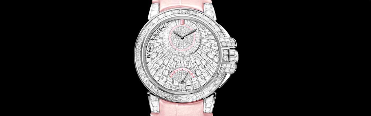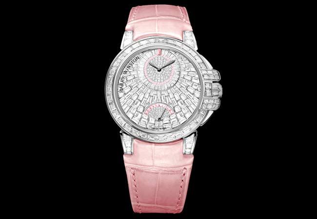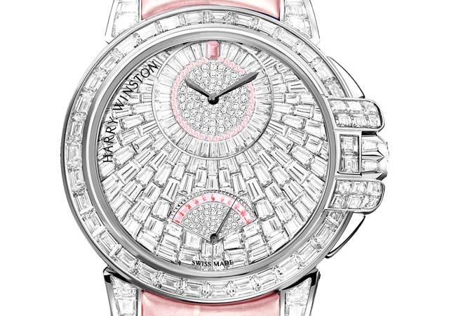 海洋 Ocean 系列 Waterfall 36 毫米自動腕錶鑲飾 404 顆鑽石和 43 顆粉紅剛玉,流光溢彩,彰顯海瑞溫斯頓寶石鑲嵌師的高超技藝。這款腕錶沿襲海洋 Ocean 系列的經典特質,包括逆跳秒鐘顯示和偏心時分盤。
