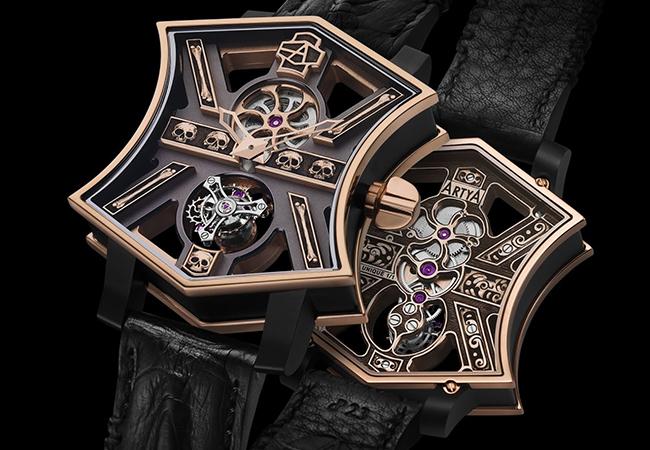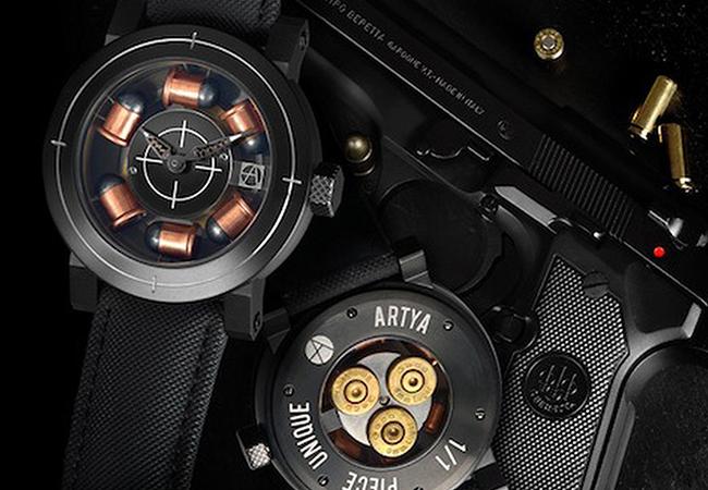 曾任HUBLOT宇舶設計師的Yvan Arpa所創立的ArtyA,所製作的Son of Sound Magic Black Torubillon,彷彿Gibson吉他頭的錶殼形狀,顯眼的骷髏圖騰,重點是,錶殼是以玫瑰金與回收的子彈合金材料所構成。而如果覺得這子,子彈的意念不夠,再看看他的Son of Gun一連串的腕錶,更是直接將子彈裝入錶殼內!