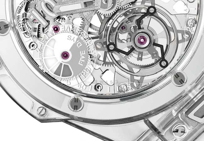 Big Bang 藍寶石陀飛輪腕錶的錶殼以整顆藍寶石雕琢,藍寶石是硬度與耐磨性僅次於鑽石的材質。將藍寶石打造鏤空機芯,整只錶彷彿憑空消失不見,機芯零件僅少數金屬齒輪能夠辨識輪廓,其它零件全部為透明:錶殼的中間層、錶耳與錶背,展現出透明的機械結構,宛如懸浮在空中。面盤、數字、時標與動力儲能顯示都是一片透明,只有鏤空式的指針掠掃而過。