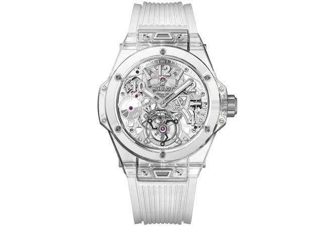 Big Bang 藍寶石陀飛輪腕錶全球限量99只,除了由整塊藍寶石水晶所切削而成45毫米錶徑外,陀飛輪支架也以堅硬而難以加工的藍寶石材質所製作。澄澈與純粹的極致融合。另外Big Bang 藍寶石陀飛輪腕錶同時推出鑲嵌48顆梯鑽款,珍貴鑽石鑲嵌於錶圈每個切面之中,任何角度皆展現耀眼光芒,搭配透明橡膠錶帶,戴在手腕上就像完全消失般令人大嘆不可思議。