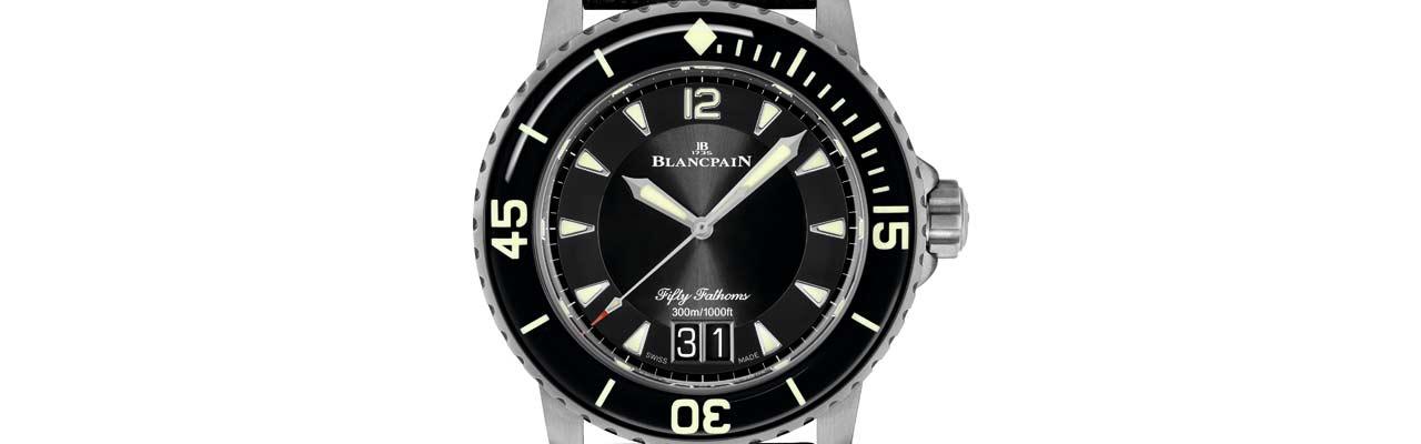 45毫米緞面拋光鈦金屬錶殼配有傳統的五十噚單向旋轉錶圈。採用硬度僅次於鑽石的藍寶石水晶製成錶面,圓拱形錶圈具有卓越的耐刮性能。延續寶珀潛水腕錶的經典傳統,全新的五十噚大日期腕錶 配備有帆布錶帶或是NATO軍用錶帶。
