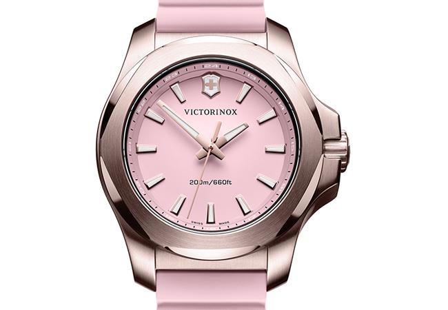 身為品牌旗下的女錶系列,I.N.O.X. V在配色的細節上自然會比較容易出現粉色調,今年新款包括這只粉紅面盤搭配同色橡膠錶帶,尺寸也滿適合女生配戴。37mm/玫瑰金PVD不鏽鋼/參考價約NTD 19,200