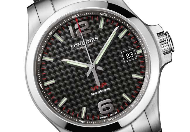 全新征服者系列 V.H.P. 腕錶備有多款面盤款式,包括優雅藍色、時尚銀色、率性黑色、以及獨特的深灰色碳纖維,可隨場合搭配率性活力的運動氣息、或是專業內斂的優雅態度,讓時尚型男能自在展現獨樹一格的風貌!Longines浪琴表更首次運用碳纖維材質於錶盤設計,交互編織出深灰色的立體錶面,突顯配戴者講究與不凡特質。4款錶盤上皆綴以鮮明的紅色V.H.P. 字樣與環型刻度,為整體錶款營造出率性獨特、活力奔放的運動氣息。