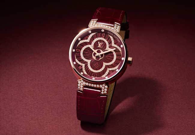 頂級款的特色包括35毫米玫瑰金錶殼、鑲鑽玫瑰金錶耳、酒紅色漆面錶盤和搭配鱷魚皮錶帶,同樣配備路易威登專利系統的可更互換式錶帶。