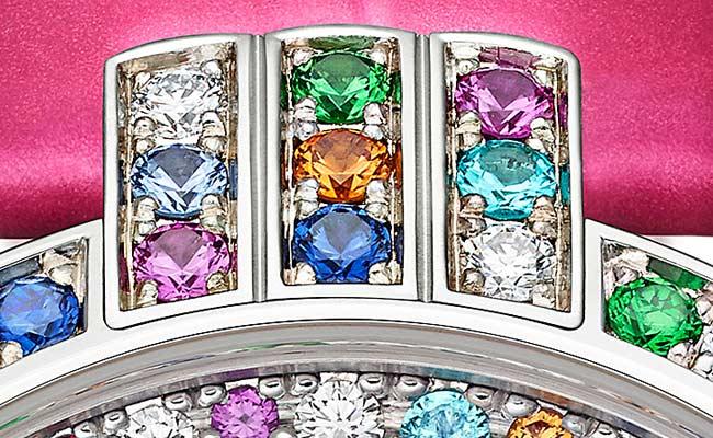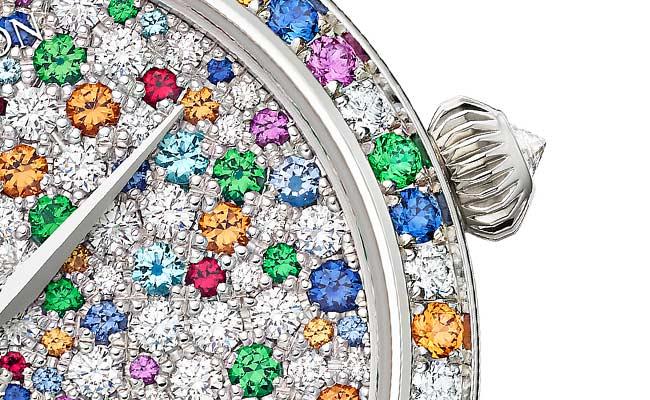 而要將八種寶石搭配鑽石,錯落鑲嵌在面盤上,雪花鑲嵌無疑是合適的首選。雪花鑲嵌的視覺美感來自大小錯落的寶石,在構思圖案後經過計算,將寶石切割成所需的形狀及直徑,接著再砌到底座上。雪花鑲嵌法看不到底座的鑲嵌特色,讓寶石像是從天空緩緩飄下的雪花,大小不一且不經意的落在表層,八種寶石在光的折射下散發出不同的光暈,看起來有種錯落的美感,和同樣傳統爪鑲技法呈現的整齊劃一,有著截然不同的視覺氛圍。