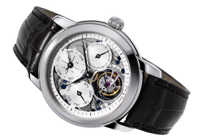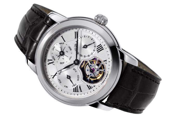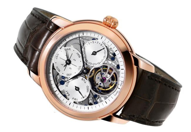 內裝自製FC-975手上鍊機芯,該當是以FC-775萬年曆為基礎加裝陀飛輪而成。單橋版的陀飛輪結構有別一般,強調來自自家廠房手筆。所採用的矽擒縱隱約可見,這也是康斯登自行開發並積極泛用於旗下錶款的零件。42mm/不鏽鋼/參考價NTD 698,000/限量88只