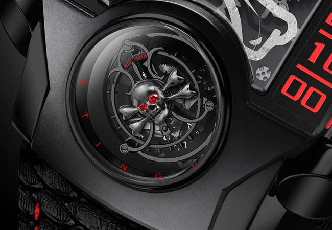 陀飛輪位於6時位置,飾有由StingHD設計的黑色鍍鉻鋁金屬骷髏圖案。要在陀飛輪上骷髏圖案的眼窩鑲嵌紅寶石,就不得不設計一個全新的陀飛輪框架,為此品牌特別於X-TREM-1 – StingHD採用特大錶殼以加強效果,黑色PVD處理鈦金屬矩形設計更顯腕錶的獨特格調。舊款X-TREM-1錶殼兩側用於顯示時分、內置精鋼小球的藍寶石套管改為黑色PVD處理不鏽鋼帶環套管,與紅色塗漆數字展現強烈科幻感。