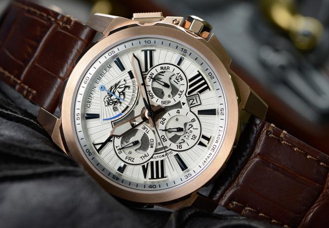 GRIFFIN EMBLEM偏向奢華的風格設計在鏤空腕錶選擇中並不常見,採用日本Miyota精密機芯、316L打磨不鏽鋼錶殼、藍寶石水晶鏡面等實而不華的規格,確實使GRIFFIN EMBLEM成為一個饒富趣味、值得蒐藏的鏤空腕錶。今年首見的年曆三眼系列,亦表現出品牌不單滿足於現有的野心。