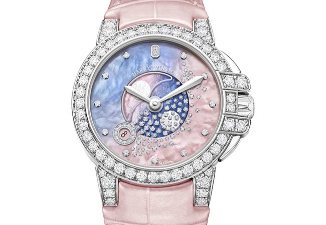 2018年的月相新作,HARRY WINSTON首次以藍寶石水晶玻璃,讓面盤呈現出雙月互映的視覺效果。面盤中央的粉色珍珠母貝,結合手繪的技法,讓顏色由淺轉深,形成由粉紅進入粉藍的漸層效果,左半邊的新月形視窗彷彿框架住天上的明月,與之相對的右半邊月相,則是半掩在鑲鑽的藍寶石水晶玻璃鏡面下,淡藍色的鋪敘看起來就像是在海面緩緩下降的月亮,增添了猶抱琵琶半遮面的若隱若現氛圍。