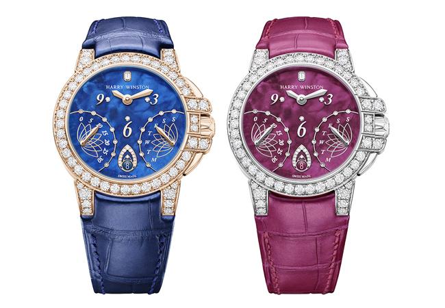 為了慶祝Ocean系列20周年紀念,HARRY WINSTON以系列的當家功能雙逆跳功能為主,推出雙逆跳新作,酒紅色珍珠母貝面盤,結合30秒以及星期盤的兩個逆跳半圓形顯示盤,半圓盤內的蓮花圖案,象徵Lotus Cluster頂級珠寶系列的圖樣,以花的圖案讓女錶細節更為豐厚。六點鐘位置的水滴形鑽石圖樣,也是來自品牌「溫斯頓傳奇之鑽(Winston Legacy Diamond)」的發想,十二點鐘位置是品牌著名的祖母綠形切工,和之前推出過以淺藍色珍珠母貝做為面盤的雙逆跳款相比,兩者呈現出不同的調性,但不變的是每個局部都鋪敘著HARRY WINSTON的基因。