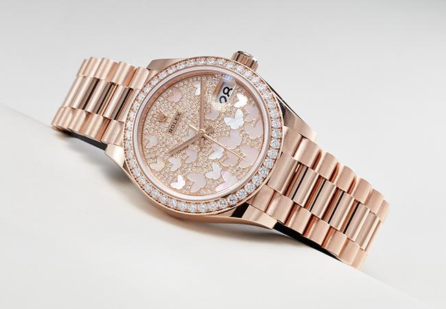 今年的勞力士的女錶主力是Datejust 31,而本款腕錶除了在錶圈鑲嵌鑽石之外,面盤更鑲嵌了262顆鑽石,並透過粉紅色珍珠母貝拼貼成眾多蝴蝶飛舞的圖案,展現少女情懷。本錶款同樣通過頂級瑞士天文台認證,全球保固五年。31mm/18ct永恆玫瑰金/參考價請電洽。