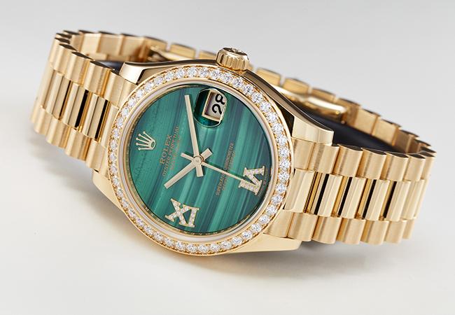 勞力士今年推出多款Datejust 31的女用腕錶,尺寸略大於Datejust 28的設計,更符合現今的流行趨勢。本錶款除了錶圈鑲嵌鑽石之外,青綠色的孔雀石面盤上,六點與九點鐘的時標亦有鑲嵌11顆鑽石;錶款內部搭載2236自動機芯,具有專利Syloxi矽游絲。40mm/18ct黃金/參考價請電洽。