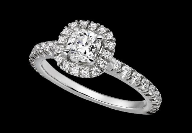 Cartier Destinée Cushion的圓環上鑲滿閃爍美鑽,垂花鑲邊盡展精美的鋪鑲工藝,令人目眩神迷。戒指上逐個雕琢的精巧凹槽將鑲座隱藏,營造出無以倫比的璀璨光芒。每個凹槽都經手工拋光,以達到與鑽石的最佳契合效果,複雜精細的工序在婉轉間令鑲座光彩盡現。