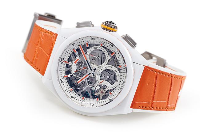 今年ZENITH特別為饒舌歌手推出三款橘色的特別版腕錶,其中這款限量25只的Defy El Primero 21計時腕錶,採用白色陶瓷錶殼,是品牌未曾使用過的設計。廠方另有推出白金錶殼鑲鑽的版本,限量5只。44mm/白色陶瓷/參考價NTD 496,300