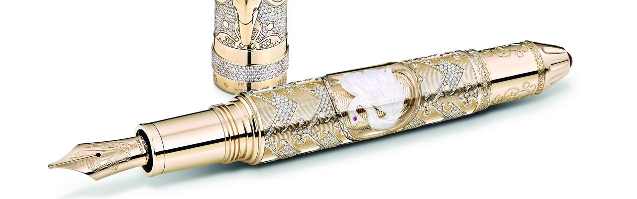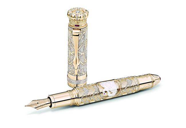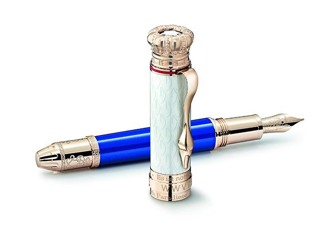 筆身的最大亮點之一就是小型羽毛工藝鑲嵌物,外層覆以藍寶石水晶玻璃,這是由手藝精湛的工匠師以幾乎被遺忘的羽毛藝術所打造,羽毛鑲嵌物外圍的實金筆身飾以扭索紋飾,這樣的設計靈感源於新天鵝堡的華麗建築。為了增加本限量款書寫工具的珍貴質感,筆蓋頂端鑲嵌一顆萬寶龍鑽石與方形紅寶石,筆尾的國王首字母縮寫姓名刻字上方鑲嵌一排紅寶石,筆夾則鑲嵌兩顆閃耀的紅寶石,象徵天鵝的眼睛。鋼筆筆尖飾以精緻複雜的雕刻設計,令人聯想到路德維希二世夢想著能夠搭乘並飛入城堡的飛行機器。