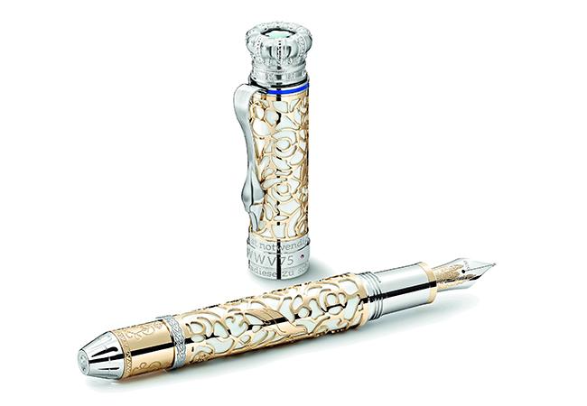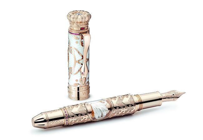 路德維希國王熱衷於打造童話樂園以及如詩如畫般的棲身之所,讓他能夠逃離現實世界,也因此被稱為「童話國王」。萬寶龍藝術贊助系列致敬路德維希二世限量版888的花鳥圖案鏤空設計靈感源於新天鵝堡奢華寶座廳的壁畫,精緻複雜的Au750實金,覆蓋以鏤空設計透出底層的半透明白色亮漆,與包鉑金天鵝造型筆夾以及雕刻配件完美契合。筆蓋環鑲嵌圓形切割紅寶石,筆蓋頂端的萬寶龍六角白星標誌採用珍貴的珍珠母貝材質製作,令人聯想到路德維希國王建造的每一座宮殿,均閃耀著金碧輝煌的光芒。