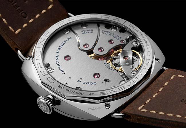 全新RADIOMIR 3 DAYS ACCIAIO –– 47毫米3日動力儲存精鋼腕錶PAM00720 & PAM00721兩款腕錶的錶背可欣賞到由沛納海諾沙泰爾錶廠自主研製的P.3000 手動上鏈機械機芯。