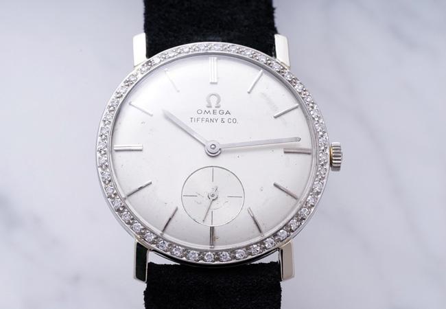這一只33毫米的腕錶配備了手動上鏈歐米茄510機芯,並沿著錶圈鑲嵌44顆明亮式切割鑽石,優雅的銀色象牙錶盤上則設有小秒針計盤。