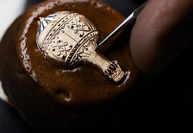 全新的Les Aérostiers熱氣球腕錶採取了立體金雕以及鏤空琺瑯兩種工法說故事,立體金雕算是江詩丹頓常用的裝飾技巧,能夠為面盤帶來如同浮雕的感覺。雖說常用,但試想能展演的空間不到40mm,面盤與錶鏡之間的高度更是侷限,要在如此受限的條件下,雕刻出栩栩如生的立體圖案以及裝飾紋理,所需技術之精湛與細膩可說是針尖蓋樓,絕對令人大呼嘖嘖。為了確保成果,在正式金雕之前,雕刻師會先以銅板雕出所計畫的圖騰,確認無誤後才正式下刀。而雕刻完成之後的修整、拋光等等工序當然也是考驗手藝。其中「巴尼奧勒1785」還進一步將金質熱氣球電鍍處理,打造不同的風韻。