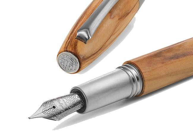 取用義大利橄欖樹的果實加工製成的橄欖油一直以來都是最頂級的代表,而MONTEGRAPPA取用橄欖樹的最高等級心材,淺色飽滿的金黃色澤,散發出一種永恆與十足的現代感,整支筆身、筆蓋完整地採用了精選有機的橄欖木心材料,搭配緞面拋光的不銹鋼筆飾,冷冽的風格與溫暖的精選橄欖木材產生強烈的對比風格,互相映襯。
