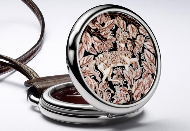 和Anita合作過的製錶品牌不在少數,百達翡麗、伯爵、江詩丹頓都曾經請她製作過面盤,和愛馬仕HERMÈS也合作很長一段時間了。除了Anita近期為愛馬仕製作結合三種琺瑯技法、馬身結合直紋面盤的Arceau錶款,她也特別提到Slim d'Hermès Pocket Panthère懷錶,因為這是她首度主動跟愛馬仕提議,要和金雕大師Jean-Vincent Huguenin協力合作的成品。