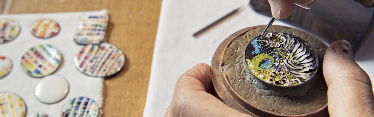 微繪、掐絲和內填琺瑯,這三種常見的琺瑯技法,Anita說無法單一選出何者的困難度最高,因為艱難的不是個別工法的展現,而是將不同技法融為一體的技術,要能拿捏技法間搭配運用會產生的反應變化,才不會讓一種技法壞了另一項工藝。