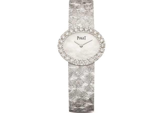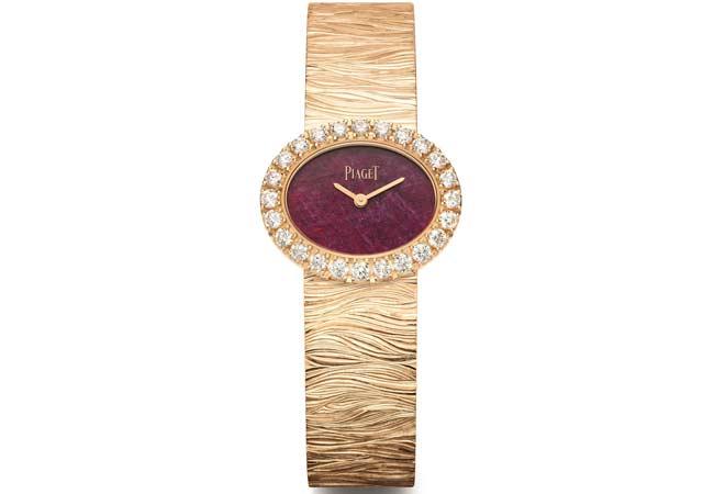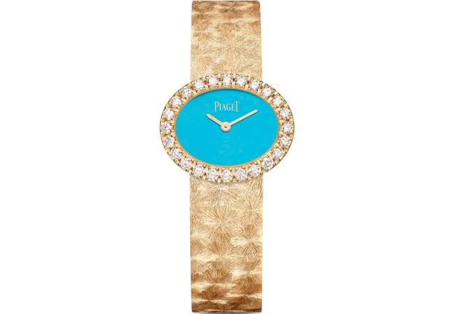 柔軟的錶帶上,被稱為「宮廷式」的裝飾工藝設計擁有如絲綢般柔滑的質感以及如樹枝般細密的紋理。此款黃金腕錶是伯爵式時尚風格的典範。綠色橢圓形錶盤四周,鑲飾多顆鑽石與四顆祖母綠寶石炫光四射,在1967年成功博得時任美國第一夫人的垂青。此款既奔放、大膽又極致優雅的傳奇腕錶象徵著一位時尚指標身上那種時常被模仿卻從未被超越的迷人魅力。伯爵於1996年購回這枚腕錶作為珍藏系列。