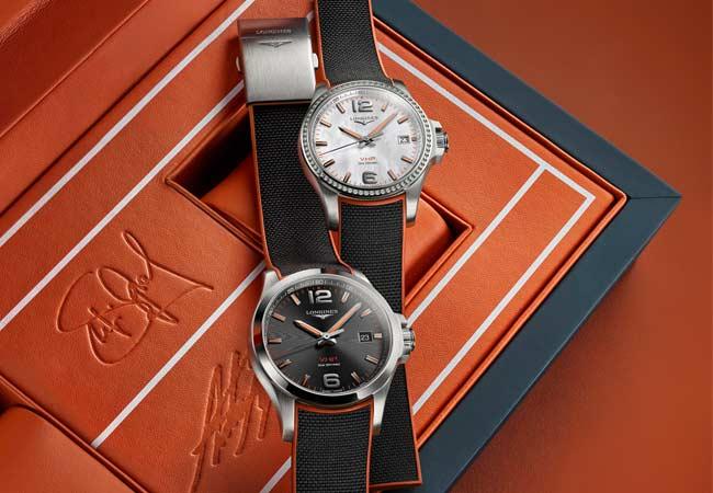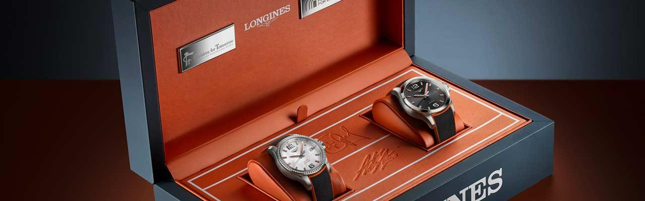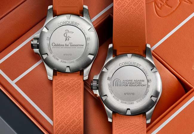 「Conquest 征服者系列V.H.P. 葛拉芙&阿格西基金會特別款」男士錶款為黑色面盤,女士款則為白色珍珠母貝面盤,錶殼鑲嵌精緻的70顆鑽石。Longines 浪琴表為了向擔任官方計時的法國網球公開賽致意,兩款腕錶的指針、時標和橡膠錶帶皆以橘色點綴,來象徵巴黎經典的羅蘭高地紅土球場。兩款錶的背蓋皆有雋刻標誌,男士款為「The Andre Agassi Foundation for Education」,女士款為「Children for Tomorrow」。最後,特別設計的腕錶收藏盒亦採用法國網球公開賽的色系,其盒內珍藏著編號1至10的兩款獨家設計腕錶。