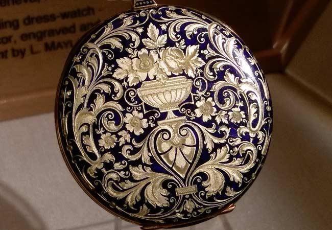 百達翡麗在2018年4月於日內瓦舉辦的珍稀工藝系列錶活動開幕前,筆者一行人已先前往百達翡麗博物館參觀。其中,百達翡麗的懷錶展區,有多款在1920年代生產的懷錶,其背面錶殼運用內填琺瑯與金雕工藝(Engraving),打造華麗的視覺效果。