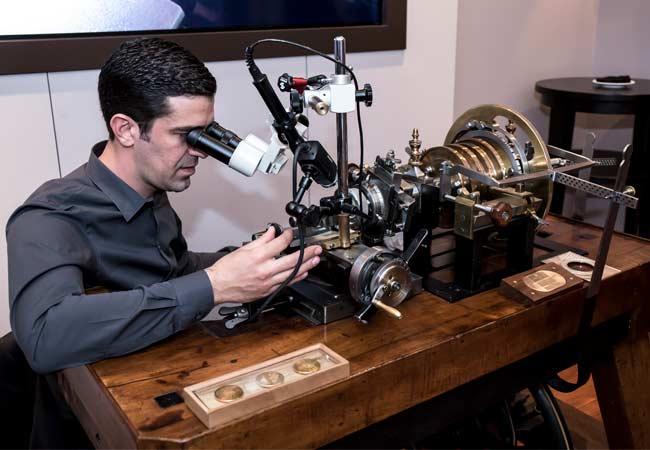 至於機刻雕花(Guilloché)則是透過固定位置的刀具,切削雕刻安裝於旋轉機台上的面盤與錶殼零件,這是與金雕工藝的最大不同之處。機刻雕花工藝曾經在瑞士幾乎要失傳,所幸在19990年代末,僅存的機刻雕花大師,將其經驗傳承下來。透過古老的機刻雕花機台,工匠們運用左手旋轉機具,右手控制刀具的力道(影響刻紋的深淺),並搭配腦海中的經驗,可以雕刻出多種傳統精緻圖案紋路。