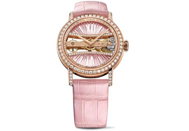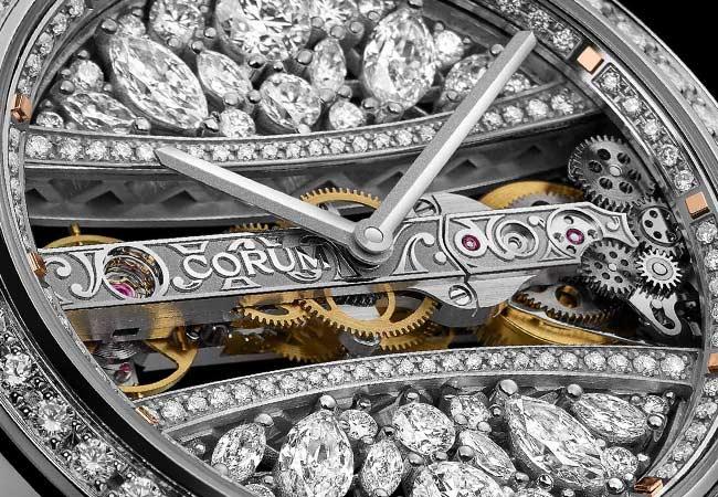 Corum 崑崙錶工匠選用馬眼形寶石打造機芯兩側蕾絲微型結構,僅僅鑲嵌寶石就需要耗時36小時,錶殼上鑲嵌 76 顆威塞爾頓鑽石,微型蕾絲結構上鑲嵌 12顆馬眼形鑽石和24顆圓形鑽石,微型結構夾板上鑲嵌 46 顆圓形鑽石,以及錶盤凸緣上鑲嵌60顆鑽石,總重量達6.41克拉,寶石光芒光線自機芯向錶殼散射,突顯錶盤光華奪目的視覺效果。