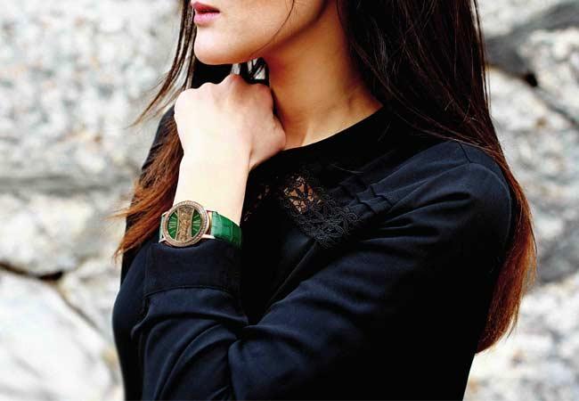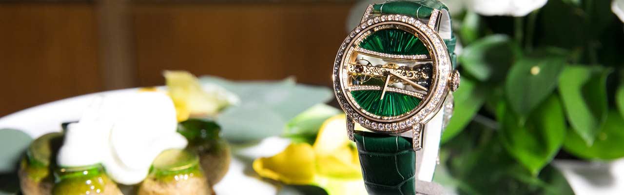 完美貼合女性手腕,讓腕錶佩戴者能夠跳脫出固有思維框架,玩味幾何圖形,作品的每個角度與細節都有著最細微的變化。金橋系列圓形腕表遵循裝飾藝術設計準則,側重於造型、材質與功能之間的和諧融洽。圓形錶殼完美配搭精美雕刻和修飾直線同軸機芯,標識性的機芯兩側,五彩繽紛寶石線狀排列,導引視覺凝聚於金橋機芯上,錶圈上手工鑲嵌的璀璨鑽石展現華麗細節,整體呈現彩虹般飽和的華麗色彩,豐富的錶款寶石配色彷如調色盤,製作難度與識別度都相當有話題,建議售價NT$1,739,000至 NT$1,970,000。