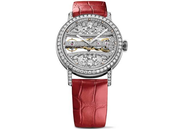 鏤空珠寶蕾絲使光線能夠徹底穿透錶體,根據角度、寶石特性及入射光線的強度,每顆寶石均綻放獨特迷人的光彩,將珠寶美學及機械工藝完美融合,配戴者能於不同時刻欣賞39 毫米金橋圓形腕錶呈現千變萬化的面貌,長方形橋狀機芯鏤空懸浮於面盤中央與寶石彩鑽輝映,打造前所未有的璀璨光彩。