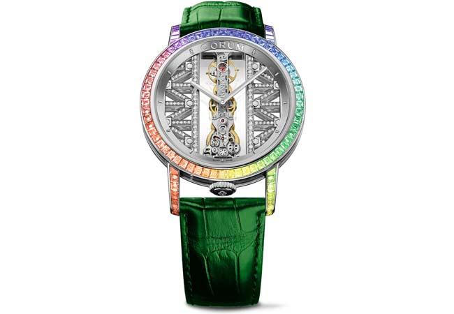 金橋系列腕錶堪稱CORUM崑崙錶作品系列的巔峰傑作,金門大橋標識性的建築主體幻化成為色彩鮮明地的珍稀寶石,淋漓盡致地詮釋了瑞士製錶的精湛工藝, Golden Bridge金橋系列圓形鑽錶,39毫米圓形玫瑰金或白金錶殼,內部搭載手動上鏈直線同軸長階梯形CO113 機芯,由義大利著名珠寶設計師 Dino Modolo 親自操刀設計。