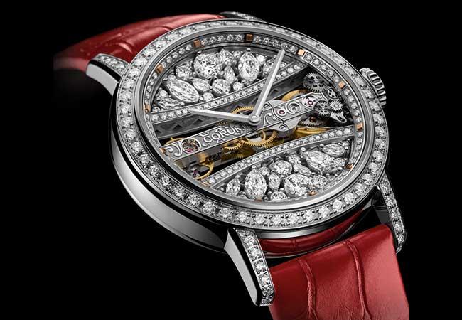 長方形的金橋機芯結合珠寶裝在圓形錶殼內,特別是金橋兩側的蕾絲狀珠寶結構形成璀璨光景,機芯兩側設有蕾絲微型結構,僅其上的寶石鑲嵌就需要耗時36小時,選用馬眼形鑽石,使光線自機芯向錶殼散射,突顯錶盤光華奪目的視覺效果。最後,鏤空珠寶蕾絲使光線能夠徹底穿透錶體。根據角度、寶石特性及入射光線的強度,每顆寶石均綻放獨特迷人的光彩。