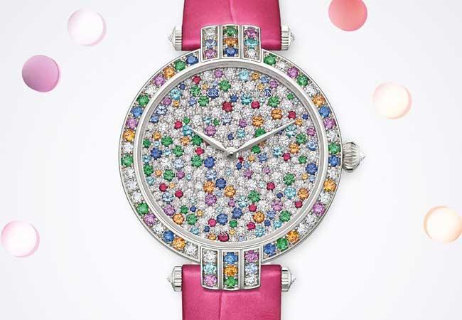 Winston Candy用了八種如繽紛糖果般的彩色寶石,切割成三種尺寸,搭配鑽石鋪敘出夢幻甜美的華美面盤。鑲嵌的視覺美感來自大小錯落的寶石,讓寶石像是從天空緩緩飄下的雪花,大小不一且不經意的落在表層,八種寶石在光的折射下散發出不同的光暈,看起來有種錯落的美感。