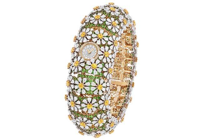 呈現的是「小雛菊」主題,黃色藍寶石、沙弗萊石和鑽石錦簇構成淡雅青蔥的春日色調。該鐲錶特別使用錯層鉸鍊結構,自然平置時,亦可輕柔環繞於手腕,一朵朵小雛菊尤如在手腕上燦爛盛開,沙弗萊石的華彩掩映其中,仿如一片柔軟的盎然草地。
