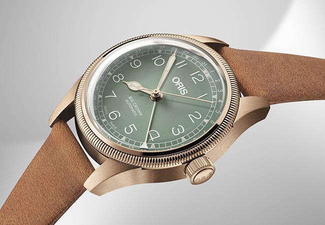 ORIS第二次推出簡約型的青銅腕錶,不過2018年款式改搭配淺綠色面盤,呈現更好的色彩搭配性。採用朝面盤周圍日期圈指示的指針式日期,讓手錶多了一些功能特別感,加上鍍玫瑰金時分針、中央秒針,並搭配天然鞣製的淺棕色皮革錶帶,種種細節讓青銅更有復古風味。